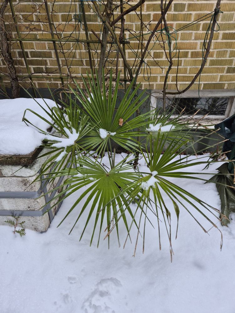 Min oskyddade palm, en Trachycarpus 'Nainital', har naturligtvis fått en del skador, men inte så mycket som befarat. Det nyaste bladet har knappt några skador alls. En del av de äldre bladen är torra i bladspetsarna, vilket dock inte är direkta frostskador, utan beror på de ihållande torra kalla vindarna från öster för ett par veckor sedan. Vindarna fick den dåvarande snön att torka bort utan att smälta. Det var nog mycket påfrestande för alla städsegröna växter. Jag har inte avtäckt och undersökt mina övriga palmer än. Förhoppningsvis har de färre skador, men de är nog inte helt oskadda.