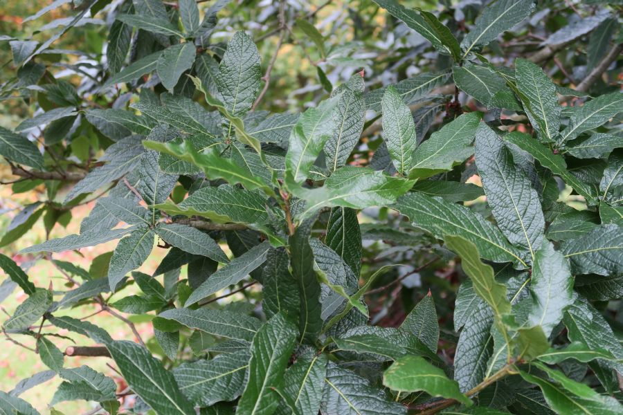 En av de vackraste städsegröna ekarter som finns är kanske den mexikanska arten Quercus rysophylla. Jag har tidigare sett arten i Dallas och flera exemplar i Hillier Gardens. Förra året hittade jag ett stort exemplar intill Rhododendrondalen i Kew Gardens, men jag missade det kanske finaste exemplaret. Vid mitt senaste besök i Oktober hittade jag dock även detta. Jag förmodar att det nog är samma exemplar som Tobias såg förra året. Det växer i närheten av ett av träden som är märkt Q. semecarpifolia. Jag har för mig att jag faktiskt såg en Q. rysophylla vid mitt besök i Kew Gardens 1997 och jag skulle gissa att det är samma exemplar, även om trädet jag såg då var långt mycket mindre. Det tyder på att det är en mycket snabbväxande art.