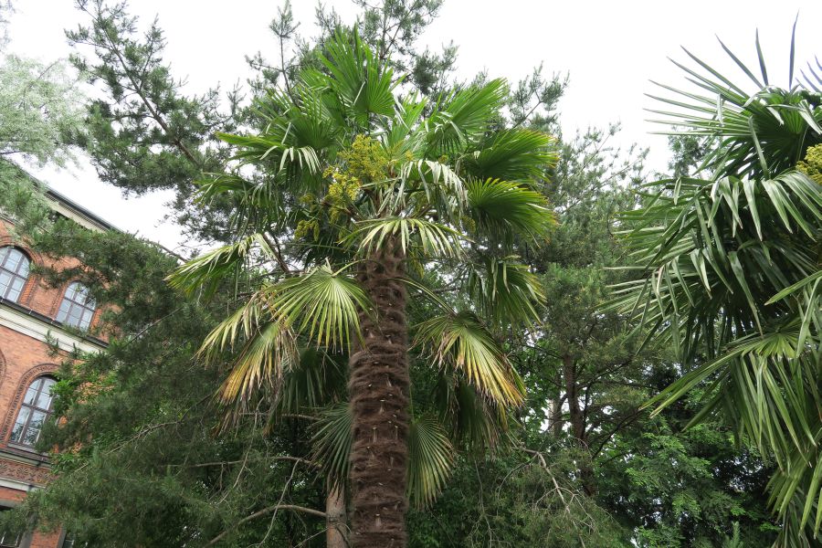 Även palmerna bakom växthusen, troligen Trachycarpus fortunei 'Nainital', liksom även Albizia julibrissin, var märkta med plastband.