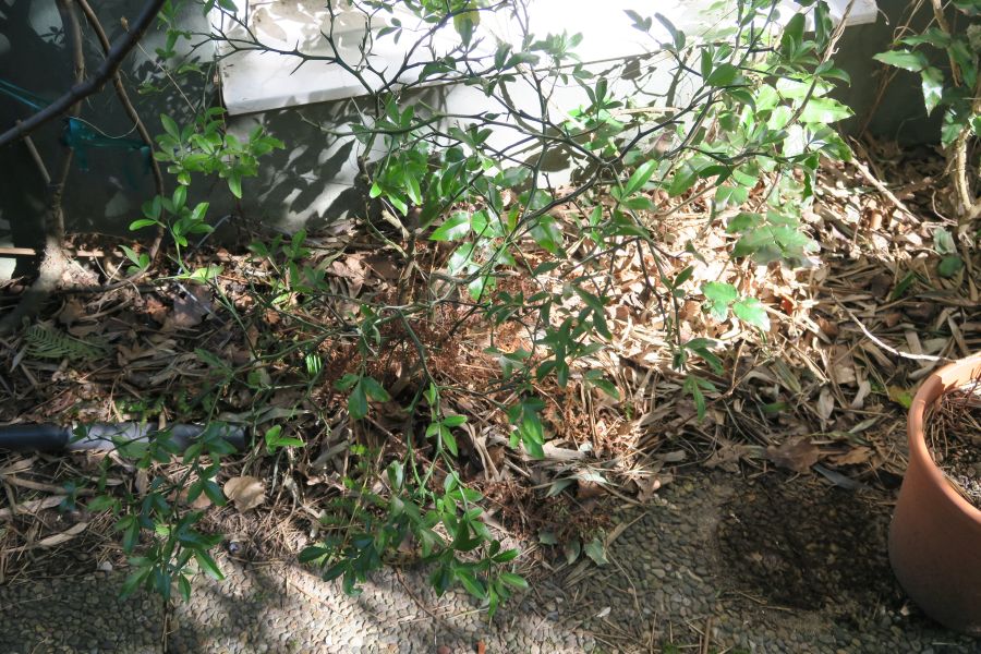 En växt som ska vara lövfällande men ändå brukar behålla ungefär hälften av bladen över vintern är Citrus trifoliata (syn. Poncirus trifoliata). Den var annars helt lövfällande så länge den övervintrade frostfritt i kruka. Bladen tycks inte ha tagit någon skada av kylan.