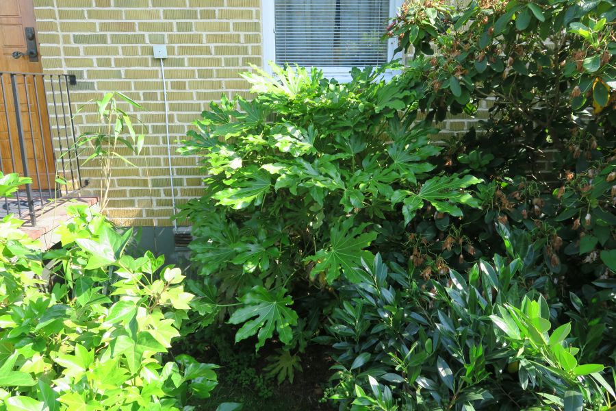 () Min Fatsia japonica klarade vintern anmärkningsvärt väl. En del skott frös visserligen tillbaka, men inte alla. De som klarade sig oskadda har haft en kraftig tillväxt i år med stora blad som effektivt döljer de skott som inte klarade vintern lika väl. Även de grenar som frös tillbaka har skjutit nya skott, men där har inte tillväxten varit kraftig.