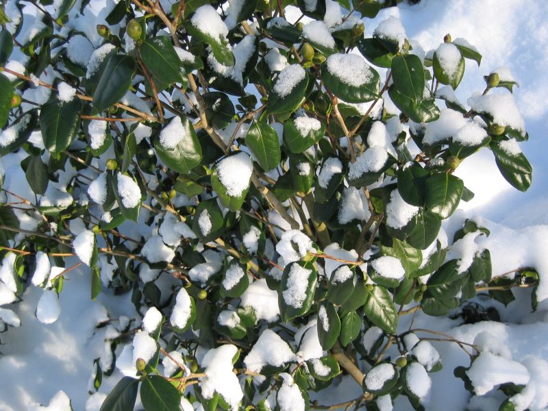 En Camellia (japonica?) i Landbohøjskolens Have, Frederiksberg. Blomknopparna ser ut att vara oskadda. Släktet Camellia är mer känt under det förvrängda vulgärnamnet "kamelia" (motsvarande förvrängning förekommer även i många andra språk).