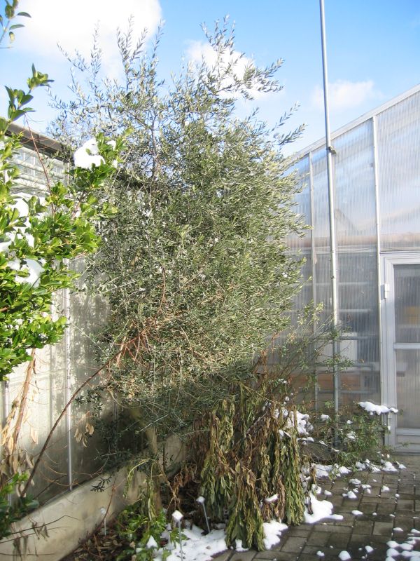 Olea europea (olivträd) mellan drivhusen vid Landbohøjskolen, Frederiksberg.