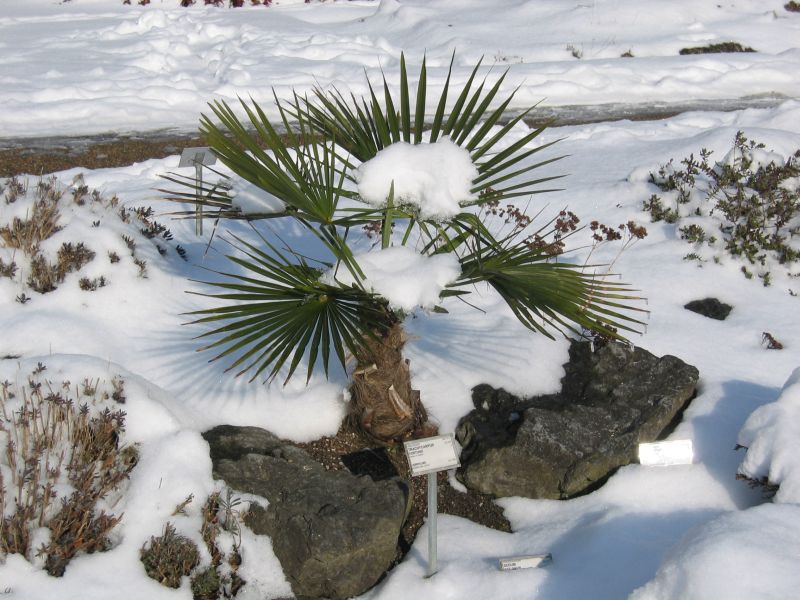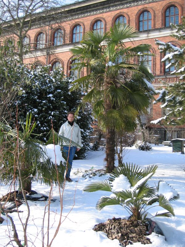 Trachycarpus fortunei i Botanisk Have. Den stora palmen har på senare år fått sällskap av ett flertal mindre palmer av varierande storlekar.
