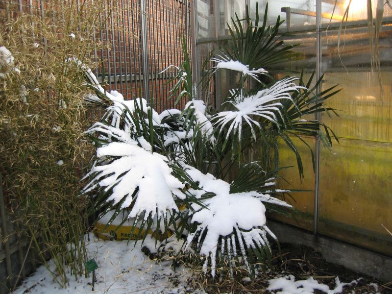 En Trachycarpus takil i en liten dold plantering av exotiska växter bakom några av de mindre drivhusen i Botanisk Have.