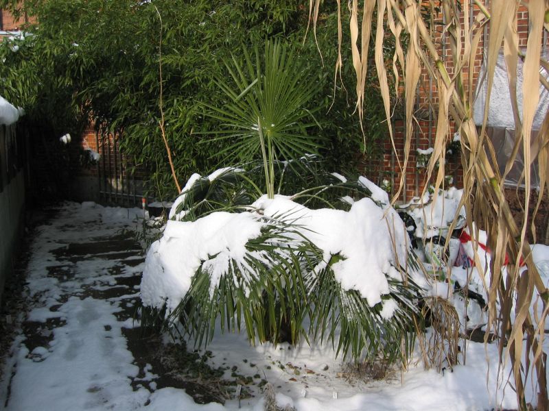 En Chamaerops humilis (med vinterskydd) som planterades ut för ett par år sedan.